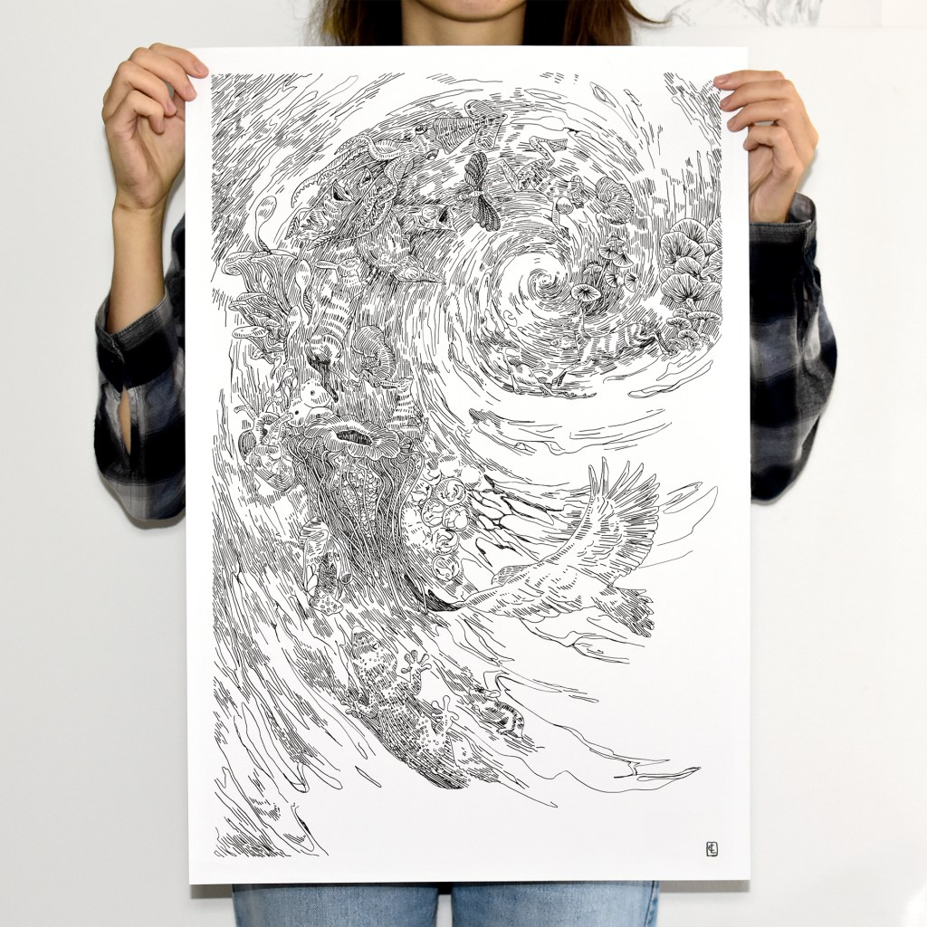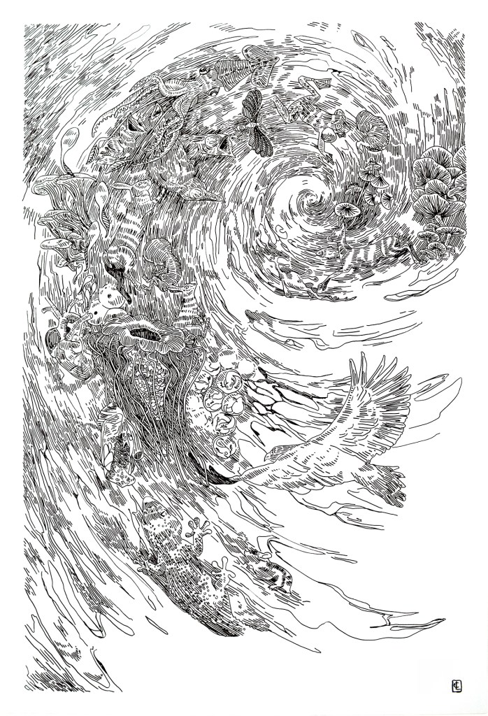 Cette illustration au format A2, réalisée en dessin traditionnel, offre une vision poétique et personnelle de la biodiversité. Dans une composition organique et dynamique, faune et flore s’entrelacent, formant un écosystème foisonnant de détails. Chaque élément dessiné célèbre la richesse du vivant, entre observation naturaliste et imaginaire.